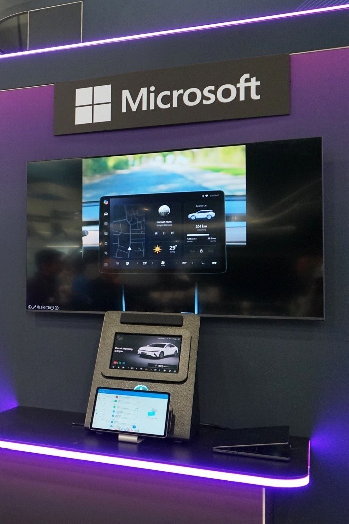 在另外一台赛轮思的独立技术展示实车中,还展示了混合式xUl的应用,融合CaLLM Edge 小语言模型(SLM)与云端CaLLM大模型功能。同时集成MobileWork(安全连接Microsoft 365,将行车时间转化为高效工作时间)以及餐饮礼宾Agent(在实时交通与停车情境下查找、预订并管理餐厅订单)等实用功能,为用户带来便捷高效的驾驶体验。