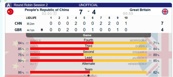 下半场一上来,中国队被偷1分,形势瞬间紧张起来。此时韩雨没有辜负冰迷对其天才少女的评价,在第7局的后手和第8局的先手,利用精准的击打各自得到2分,中国队6:3反超,就此奠定胜局,最终7:4赢得开门红。